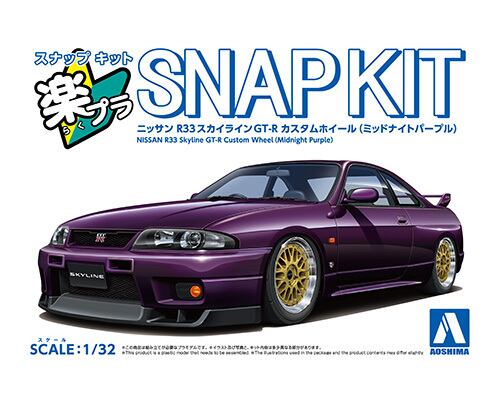 R33型 GT-Rにボディ色ごとに付属のホイールカラーが異なるカスタムホイール仕様が追加。選択式でローダウン仕様も組み立て可能。18インチ設定のカスタムホイールとカスタムタイヤ仕様で、R32型・R33型・R34型と集めれば組換え遊びが可能。自由な発想で楽しもう。